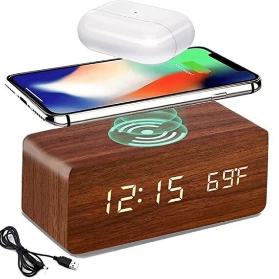 Bluebell Wooden Digital Smart Alarm Clock with Wireless Charging, 3 Alarms, LED Display, Temperature, Sound Control and Snooze, Digital Table Clock for Home, Office, Desk, Students(Brown)